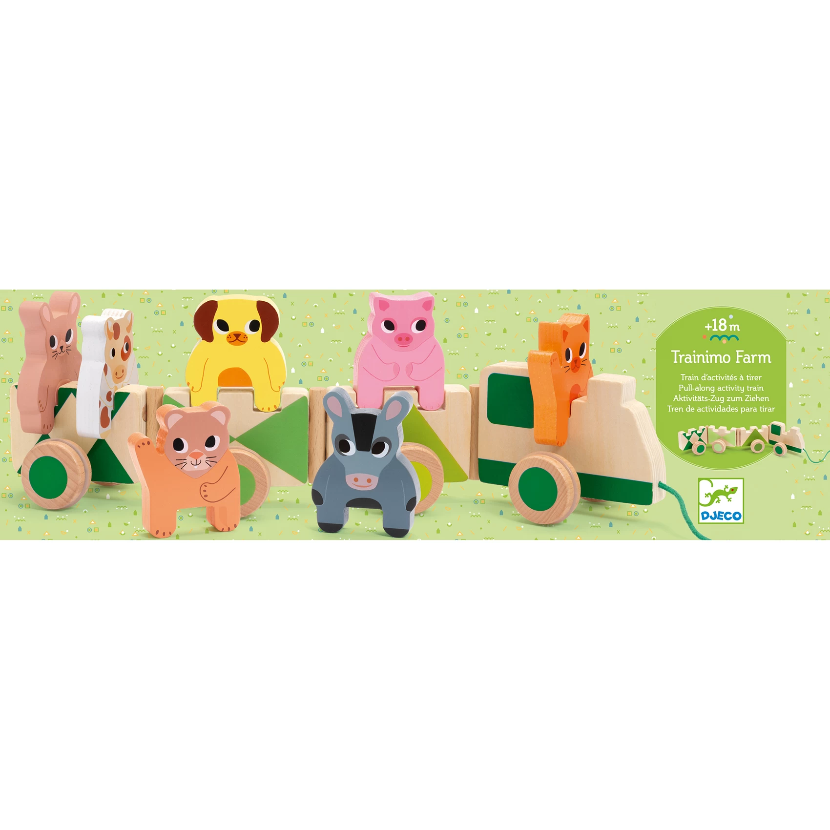 Un joli train coloré en bois avec des passagers animaux de la ferme. L’enfant s’amuse à placer les sept animaux sur les quatre wagons et les promène à l’aide du lacet. Lorsqu’ils descendent du train, les animaux tiennent debout et l’enfant peut s’amuser à jouer avec autant qu’il le souhaite ! Contenu : 1 train de 4 wagons et 7 animaux en bois (1 chat, 1 chien, 1 souris, 1 vache, 1 âne, 1 lapin, 1 cochon).