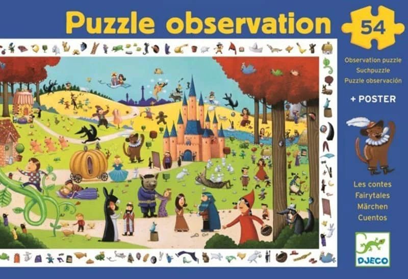 Un puzzle observation de 54 pièces où se mélangent les personnages des célèbres contes . Du Petit Chaperon rouge, en passant par Cendrillon, l’enfant s’amusera à les reconnaître. Il crée son puzzle puis s’amuse à retrouver dans l’image les éléments de la frise. Contenu : puzzle carton de 54 pièces (61 x 38 cm), un poster.
