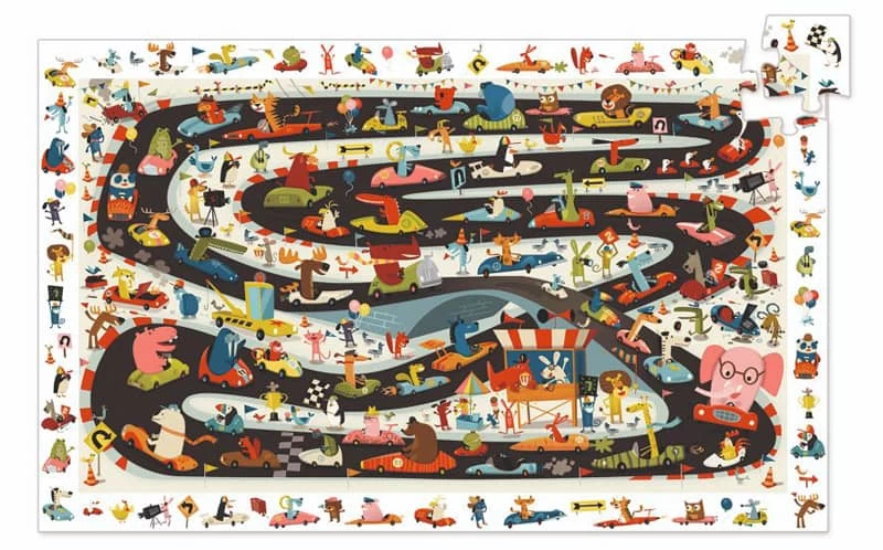 Un puzzle observation de 54 pièces sur le thème de la course automobile. A vos marques, prêts, partez ! Qui sera le grand gagnant ? L’enfant crée son puzzle puis s’amuse à retrouver dans l’image les éléments de la frise. Contenu : puzzle carton de 54 pièces (61 x 38 cm), un poster.